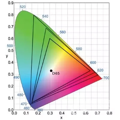 在電影放映的各種指標(biāo)中,色域和亮度是最重要的兩個指標(biāo)。如下圖光譜所示,整個彩色區(qū)域是人眼可以看到的所有顏色,從小到大的三個三角形區(qū)域是業(yè)內(nèi)不同級別的色域標(biāo)準(zhǔn),分別為Rec.709,DCI P3和Rec.2020。越高級的色彩標(biāo)準(zhǔn)所涵蓋的顏色越豐富,尤其體現(xiàn)在綠色和紅色兩種人眼最為敏感的兩個顏色上。