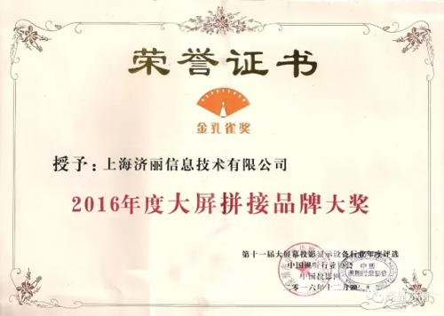 作為大屏幕行業最具專業性、權威性、影響力的年度評選活動,經過三個月的激烈關注,在評選的過程中,各品牌旗鼓相當,勢均力敵,經過廣大網友激烈投票后,終于一決勝負!Genius商顯濟麗憑借自身實力,最終獲得“2016年度大屏拼接品牌”、“2016年優秀案例”雙料大獎。獲得如此殊榮,是對濟麗品牌發展、技術進步、產品革新和優質服務的認可,更是鞭笞著濟麗人向著更遠大的目標前進!