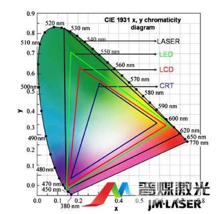 由圖* 可知,RGB純激光光源可以還原、顯示的顏色達到自然界顏色的90%以上,遠遠大于傳統燈泡光源(約60%)。