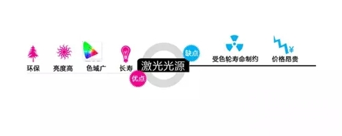 第二則是技術成熟,激光光源的分類已經出現,從單色藍色激光配合熒光粉色輪,到雙色激光以及RGB激光,目前都有自己的應用市場。這種技術上的分類,也讓激光光源的成本有了很大的變化,同時拓展了激光光源應用的市場范圍;
