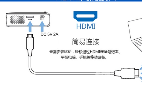 在應用中,用戶只需通過HDMI高清數(shù)字接口,可輕松快速連接筆記本、上網本、PAD、手機、相機等移動設備,連接的同時通過USB供電,即可完美同屏鏡像投影,進行分享設備內的圖片、視頻等文件,無需安裝任何驅動,投影演示就是如此簡單,您可輕松通過120英寸的超大畫面展示您的視頻、照片、商務方案等一切內容。超輕薄的機身可直接拿在手里,使用非常方便。