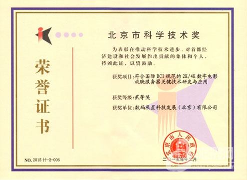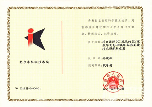 2月19日的北京市科學(xué)技術(shù)獎(jiǎng)勵(lì)大會(huì)上,副市長(zhǎng)宣布辰星科技公司完成的數(shù)字電影放映服務(wù)器產(chǎn)品,獲2015年北京市科學(xué)技術(shù)二等獎(jiǎng),并親手頒布獲獎(jiǎng)證書(shū)。