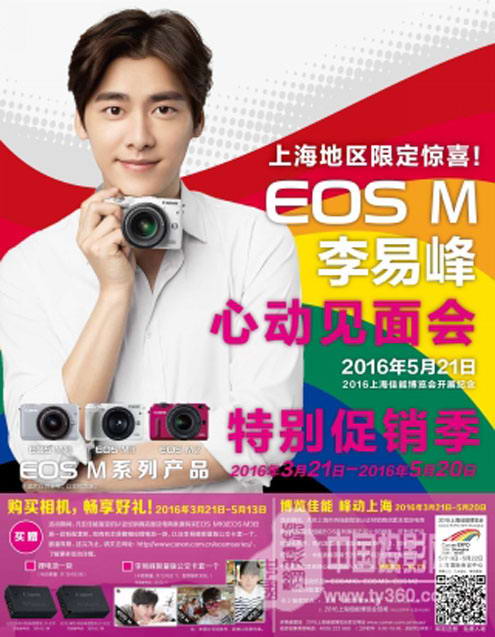 除以上買贈外,佳能還提供了參加李易峰心動見面會的機會。3月21日-5月20日期間,凡在上海市內佳能指定的認證經銷商店面及電商渠道購買EOS M10/M3/M2任意標配套機,可憑相關原件在指定地點抽獎(詳見店內海報),中獎者將獲得2016年5月21日在上海國際會議中心舉辦的李易峰心動見面會入場券一張,有機會與男神溝通交流,心動不如行動。(詳情請登錄:2016上海佳能博覽會官方頁面www.canon.com.cn/expo/ “店鋪佳禮”)