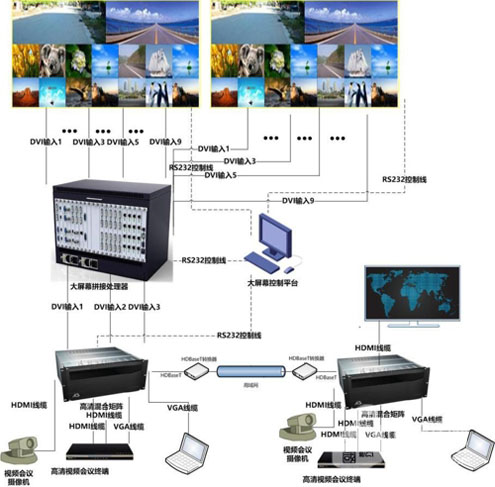 視頻輸入部分預留至少6路HDMI信號介入3套高清視頻會議系統,同時,預留至少5個小會議室5路HDBaseT高清DVI接口,預留至少2路VGA接口為介入會議大廳內的電腦信號提供接口,預留至少2路高清視頻會議攝像機HDMI信號。