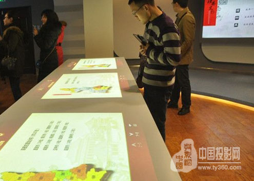 桌面互動投影顯示系統,主要是為參觀者提供新資料查詢服務。由3臺Sonnoc(索諾克)SNP-EW400C投影機軟融合組成,吊裝豎投,通過軟件和攝像頭采集,參觀者通過手觸桌面的內容分類標題,可以查看陜西境內所有的歷史文物古跡的名稱、數量和內容簡介,開闊參觀者的歷史知識視野,并對陜西境內的歷史古跡進行體系化的宣傳推廣。