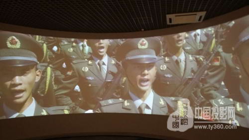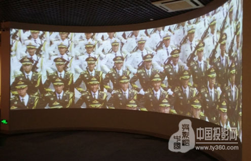 展項使用了3臺SEEMILE激光工程投影機PX700 7000流明 1024*768激光投影機進(jìn)行7*2米弧形大屏融合,通過大屏融合軟件顯示一個完整的沉浸畫面,視頻播放的是九三大閱兵的場景,通過大屏幕看到中國軍人的雄糾糾氣昂昂的風(fēng)采,充分展現(xiàn)了中國人民解放軍的鋼鐵精神。(看到這小編也被激起男兒參軍報國的熱血哦)
