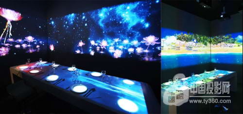 隨著高端工程投影機投入到更多細分領域,展會現場,明基還應用5臺工程投影機,搭建了沉浸式多媒體餐廳解決方案演示區,四周墻面及餐桌上投影美輪美奐的畫面,通過營造不斷變化的場景氛圍帶給顧客沉浸式體驗,邊用餐邊享受視覺藝術盛宴。美食、科技和藝術結合的方式,盡顯高端奢華品味,大大提升了餐廳形象。