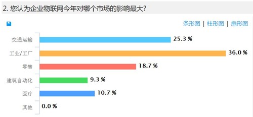 2. 企業(yè)物聯網今年對工業(yè)/工廠市場的影響最大,交通運輸行業(yè)次之。對工業(yè)/工廠領域而言,工業(yè)4.0對于物聯網發(fā)展的推動是不可忽視的一大助力。