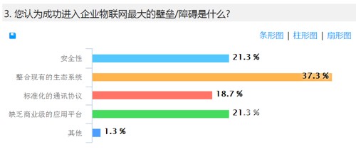 3. 整合現有生態(tài)系統(tǒng)是目前企業(yè)成功進入物聯網最大的壁壘和障礙,安全性及缺乏商業(yè)級應用平臺也是目前令企業(yè)用戶望而卻步的兩大問題。