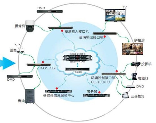 為會議中心各個終端設備提供控制接口,如顯示終端、DVD、空調、燈光、攝像機、音頻矩陣等