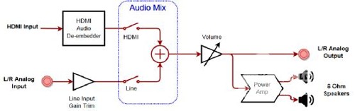EMX-I-AMP可以插在HDMI輸入口,提供音頻放大功能,可直接驅動兩個或四個8歐姆的揚聲器。EMX-I-AMP提供一個單獨的音頻輸入,可以切換獨立或混合輸出,可以通過前面RS232和IP對音量進行調節。
