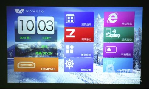 傳統投影機要連接電腦、U盤或儲存卡,開機后不能直接使用,窩窩頭V6由于搭載了Android 4.2系統,開機后就可以進入主界面,與普通的電視盒子在使用上相似。在進入系統后,你可以看到“我的應用、網址導航、新聞雜志、娛樂互動、更多應用、本地播放、系統設置和WiFi設置”八個選項。