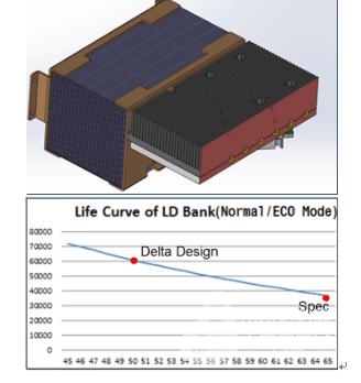 為了達到與LED光源一樣的超長壽命,免維護,臺達在設計第四代光源(激光)DLP顯示單元時采取針對技術設計。激光光源的壽命與溫度密切相關, 臺達采用智能散熱設計與電流調整技術,采用了業界最先進的嵌入式真空熱導管散熱技術,縮短熱源,以及更高效率的熱導管及散熱鰭片設計,精確控制光源溫度,保證光源長期高效穩定,保持亮度及色溫恒定;早期色輪是影響激光機芯壽命的一個環節,臺達在色輪設計及制造中采用特殊結構、特制材料及電流調整技術,有效提高色輪壽命,從而提高光源整體壽命,達到超長60000 小時。