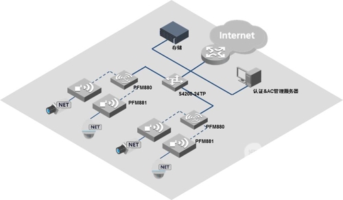 PTMP(DH-PFM880)與CPE(DH-PFM881)實現(xiàn)點對多點無線遠程連接,實現(xiàn)3km半徑內(nèi)無線局域?qū)>W(wǎng)組網(wǎng),最大帶寬3Mbps;根據(jù)現(xiàn)場情況,采用蜂窩無線布置4臺PTMP進行360°無線覆蓋(單臺PTMP設備為水平90°)。