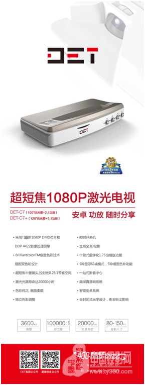 DET德浩展位的家庭影院由最新的激光產品DET-C7組成,搭配了100寸大屏抗光幕、2.1聲道音響、高清前置攝像頭等,供現場參觀者體驗了一番隨錄隨播的功能。DET-C7配備了內反射式超短焦鏡頭、1080P高清分辨率,實現55厘米超短距離投影100寸大畫面,最大程度的節約了客廳面積。此外,DET-C7還內建安卓系統,支持個性化APP應用,內置無線WIFI,全力打造一站式影音中心,操作簡單,非常適合家庭使用。