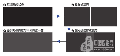 對融合畫面效果影響的另一個重要因素是投影機自身的漏光問題。當(dāng)顯示畫面較暗時,投影機的漏光問題導(dǎo)致融合帶的亮度高于其他區(qū)域,而H4融合器通過暗場補償技術(shù),確保畫面在顯示各種內(nèi)容時,亮度仍然一致。