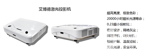 與此同時,激光投影機的出現也激發了教育投影行業的新活力,重新樹立了大眾對投影技術的信心,激光投影與電子白板組合而成的多媒體教學系統成為用戶的新選擇。在這種趨勢下,深圳市艾博德科技股份有限公司與富士康集團強強聯合,攜手推出全新超短焦激光投影機。憑借其更好的顯色性能、更高的亮度、終身沒有耗材和更低的維護成本,獲得了廣大教育用戶的青睞。“高雅氣質、顏值擔當”,艾博德股份超短焦激光投影機帶你體驗全新“視”界。