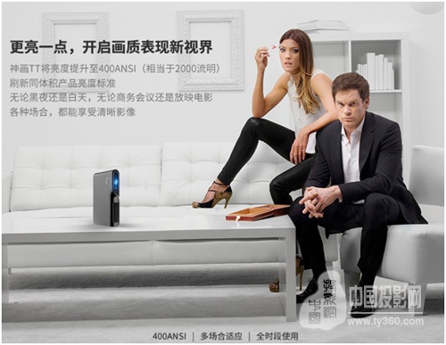 神畫TT超級投影定位于商務精英人群,法拉利跑車外觀給人高端印象,其核心賣點“高亮便攜”也正適合該類受眾。在行業內便攜類智能微投中,普遍存在亮度不夠的問題,例如極米Z4air、堅果P2、酷樂視X6等,神畫TT超級投影亮度達到400ANSI流明(2000流明),領先行業;而與同亮度的家庭類投影儀相比,神畫TT超級投影又有著小巧輕便的特點,并自帶長達2小時續航的電池,方便用戶隨時隨地使用。神畫TT超級投影成為行業中第一個做到高亮與便攜最全面兼顧的產品,為行業樹立了新標桿。