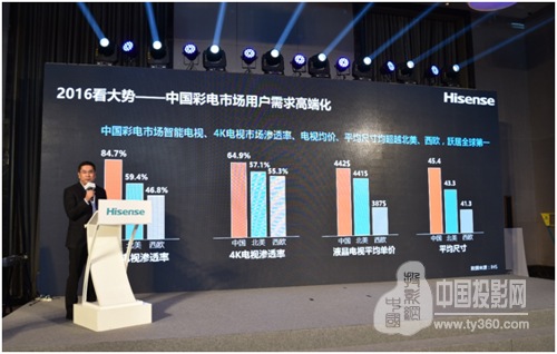 海信發布的電視產業年度發展報告顯示,2016年,中國彩電市場在全球彩出貨量下滑背景逆勢增長,主要受益于中國彩電消費市場高端產品需求的增長。從全球來看,中國市場智能電視、4K電視的市場滲透率以及電視均價和平均消費尺寸均超越北美、西歐,躍居全球第一。