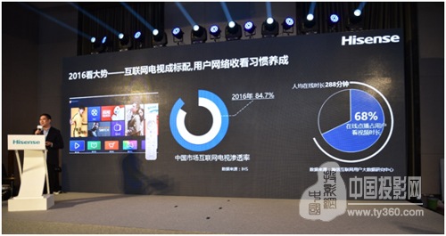 海信報告顯示,2016年中國彩電市場的互聯網電視滲透率高達84.7%, 互聯網電視已成標配。隨著互聯網電視的普及,用戶用網絡來收視的習慣已經養成。海信互聯網用戶大數據研究顯示,互聯網電視用戶日均在線時長接近5個小時,在線視頻點播已經成為用戶看電視的第一選擇,占用戶看視頻時長的68%以上。
