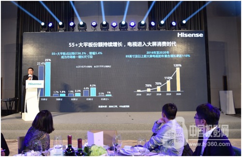 2017年,55+大平板占比預計將達到36.3%,市場份額增幅5.4%,成為市場唯一增長尺寸段。未來五年,85英寸以上超大屏市場復合增長率達到110%,電視大屏消費時代已經到來。