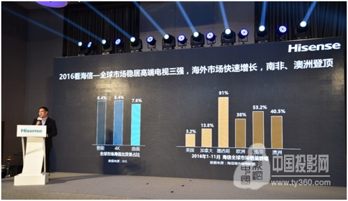 2016年,海信贊助了F1紅牛車隊、澳網公開賽等眾多國際賽事,特別是2016歐洲杯的贊助,助力海信全球知名度和品牌形象大幅提升。受益于全球化品牌運營,海信海外市場高速增長,在歐洲、澳洲、南非、墨西哥等重點市場增幅均在30%以上,在南非和澳洲市場連續多個月份高居市場第一。