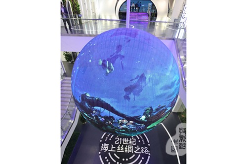 展館中還特別設立了一個體現(xiàn)“21世紀海上絲綢之路”主題的直徑4.8米的曲面點陣LED地球,通過數(shù)字CG動畫向觀眾展示寶安在世界版圖中所處的獨特位置,寓意在歷史上承擔中國海上絲綢之路重要角色的寶安,也必將在21世紀海上絲綢之路的建設中發(fā)揮更重要的作用。而這個令人耳目一新的球,通過吊頂安裝和特殊的軟件設計,其不僅以簡潔新穎的外觀為該展館增添了一道靚麗的風景,更可通過亮度調(diào)節(jié)在任何光照環(huán)境下完美展示色彩絢麗、圖像比例還原準確的畫面。