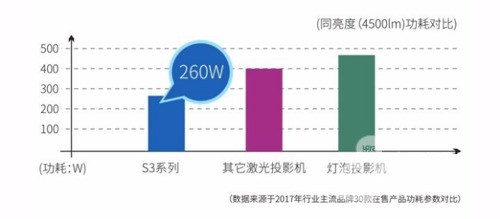 應(yīng)用ALPD®激光顯示技術(shù)的S3系列光源壽命長(zhǎng)達(dá)25000小時(shí)以上,在整個(gè)壽命期內(nèi),色彩飽和度和亮度衰減幅度也很小,不用換燈泡,省錢(qián)省心免維護(hù)。此外S3系列激光投影機(jī),整機(jī)電源功率260W/290W,在高亮度的同時(shí)保持更低功耗。相比于一般投影機(jī),光峰S3系列能夠省電30%。