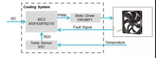 工業以太網交換機和服務器在功率較大時會產生較多熱量,通常需要進行散熱來保證系統正常工作,一般會采用安裝散熱風扇的方案。對于帶溫度測量反饋的可調速風扇散熱系統,根據對象溫度靈活調節風扇轉速,同時用MSP430微控制器作為控制平臺,與主機通過I2C接口通信,加入故障檢測和報警功能,具有可靠性高、控制靈活、節省系統能耗的優勢。