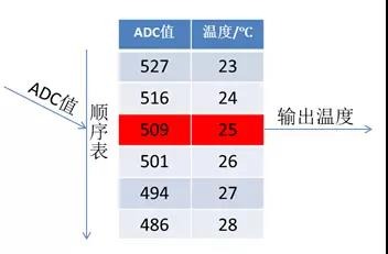 因為涉及到復雜的對數運算,對于低成本精度要求不高的場景,采用實驗測量標定生成溫度與ADC采樣值的對應表格,查表法更適合。首先用溫控設備,標定出溫度與ADC采樣值的表。由測量電路結構可知,ADC采樣值與當前溫度成反比關系,因此測出的數據表為順序表,可采用順序查表算法。