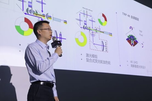 在本次巡展活動中,我們還有幸采訪到明基中國投影機事業部產品經理張志軍先生。據張志軍介紹,投影亮度是激光投影機重要指標。明基初期使用獨立激光單體配合單熒光輪設計,透過成熟的純藍激光,激發熒光輪產生綠色與紅色光,最后加上激光自身的藍光,完整提供RGB三原色。為提升亮度、促進光學系統小型化,明基后來采用全新模塊化架構激光發光模組,取代獨立激光單體,提升激光能量密度,也讓熒光轉換后的光線更多集中到DMD芯片上;最新設計則是用更高密度激光模塊,搭配復合式熒光輪加色輪的雙色輪系統。