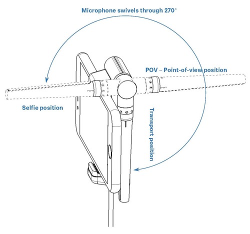 在卡扣上,話筒可轉動270°:從手機背面的0°關閉和收納位置,到采訪/拍攝(POV)位置,還可進一步旋轉到“自拍”位置。共有14個鎖定位置,以便從最佳角度把話筒指向聲源。