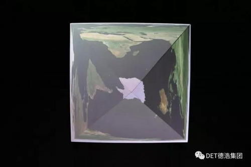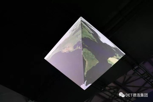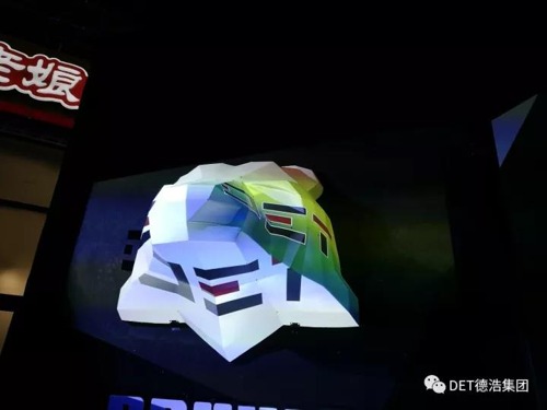 現(xiàn)場(chǎng)可以看到,DET給我們帶來(lái)了金字塔造型的異形秀,只用了2臺(tái)8500流明的DET-S85U投影機(jī),便完成了底邊1.5米,高為1米的四面體金字塔造型的投影。