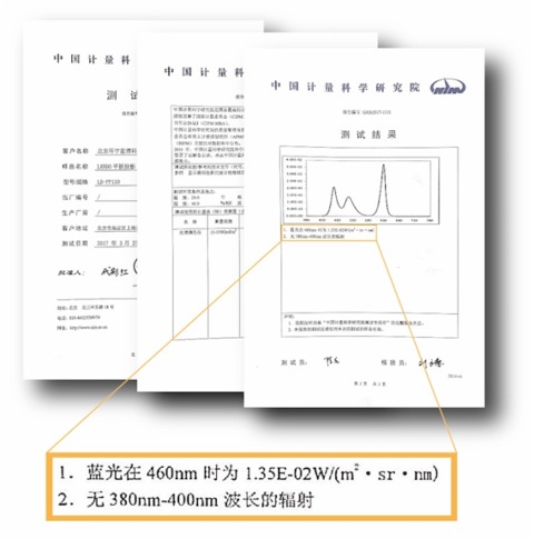 LANBO平板投影自發光特性以及屏幕表面有專利屏幕保護,LANBO平板投影藍光波段主要集中在460nm處,通過了“中國計量科學研究院”測試報告顯示,LANBO平板投影的藍光在460nm輻射亮度為0.0135W/㎡·sr·nm,遠低于100W/㎡·sr·nm無危害的標準,同時相當于OLED屏幕藍光輻亮度的1/10,此數據也表明LANBO平板投影對人眼的傷害,可以忽略不計。