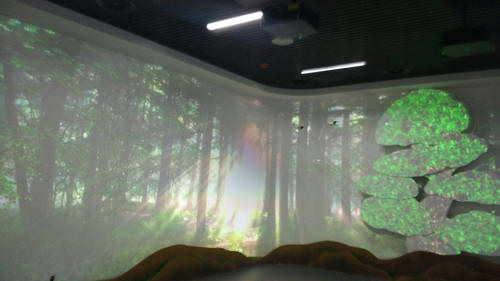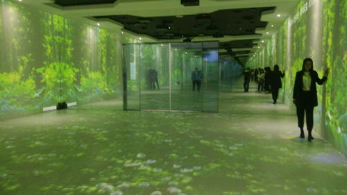 該中心的展示手段也頗具匠心。15臺(tái)投影機(jī)以U型方式投射于三面墻上,配合定制演示軟件及互動(dòng)設(shè)備,完美呈現(xiàn)全包圍沉浸式體驗(yàn)的極致魅力。3臺(tái)投影機(jī)被用于投射不同形狀的圖像,用于靈活演示不同類型的展示內(nèi)容。4臺(tái)用于投射柱幕,打造不同尋常的視覺(jué)沖擊力。