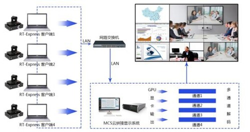 重要領導參與的視頻會議與會商協作,MCwall輕松實現。RT-express迅屏功能可將筆記本電腦、平板等設備與視頻會議系統完美結合,采集基地中分別位于不同房間的8路信號建立實時視頻會議。
