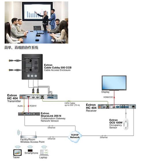 我們很高興的推出了 HC404, 這一適用于小型協作空間,操作簡單的視音頻系統解決方案。該切換發送器和帶圖像解析度功能的接收器能夠通過單根 CATx 電纜傳輸視頻、音頻和電源至 70 m(230') 遠的距離。HC 404 的發送器支持兩路 HDMI 和一路 VGA 輸入,接收器支持一路本地 HDMI 輸入。采用了 Extron 先進圖像解析度轉換技術的接收器保證了卓越的圖像細節和顏色的精準度,確保完美的畫面質量。內置控制功能可實現圖像的自動切換控制、顯示控制以及占用傳感器控制,以方便沒有操作經驗的用戶使用。設計用于專業集成環境,小巧的 HC404 發送器和接收器適合被安裝在講臺、書桌下方、顯示器后方,以及其他空間有限的應用環境。