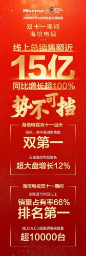 海信電商數(shù)據(jù),原來啊在雙11期間,海信電視線上總銷售額近15億,同比增長超100%!
