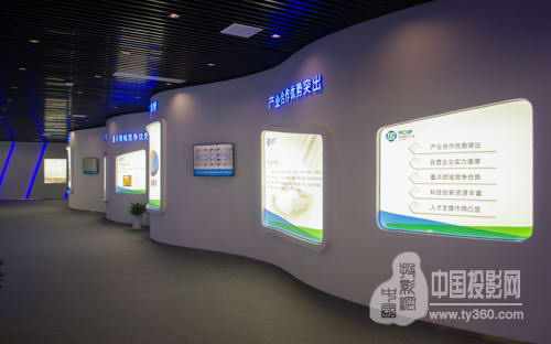 12米(寬)*8米(深)*6米(高)的顯示尺寸帶給參觀者廣闊的視野,隨著視頻的播放,鏡頭由遠及近,人站在走廊前仿佛也跟著走進了畫面中,逼真的臨場感讓你能切身感受到產業園的規劃及未來發展前景。