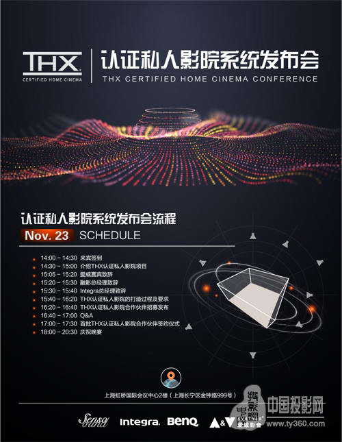 半年多的市場期待,11月23日,“THX認證私人影院”項目發布會將會在上海虹橋國際會議中心揭幕,THX認證私人影院項目正式開啟。屆時,我們將迎來全國近百名業界優秀合作伙伴,與THX、美國勝賞SensaSound、明基BenQ以及Integra安橋等著名品牌,共同為大家點亮天璣。