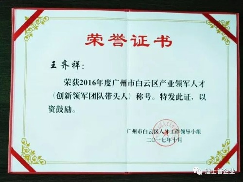 企業(yè)良好的發(fā)展離不開正確的指引與規(guī)劃。迪士普信息科技有限公司總經(jīng)理王齊祥先生被 授予“2016年度廣州市白云區(qū)產(chǎn)業(yè)領(lǐng)軍人才(創(chuàng)新領(lǐng)軍團隊帶頭人)稱號”, 以表彰他對白云區(qū)的創(chuàng)新、創(chuàng)業(yè)工作作出的突出貢獻。