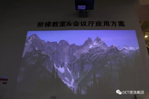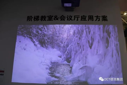 鑒于市場上普遍都是用工程機投影解決階梯教室與會議廳的對大畫面的需求,此次DET“另類”地展示了超短焦激光工程DET-C5,表達了一種觀念,就是會根據客戶的實際需求提供不同類型的解決方案,創造顯示價值。DET-C5,理論值可以投影80-150寸畫面。本次展會超短距離41.7cm即可投影120寸大屏幕,亮度3600流明,支持1080P全高清畫質,畫質細膩出眾。