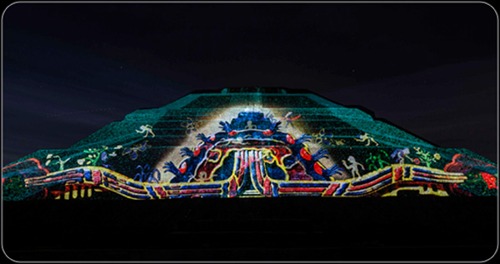 每場45分鐘的燈光秀,在宏偉的太陽金字塔上投影大量畫面,再延伸到亡靈大道,最后投影在月亮金字塔上。19臺科視Christie Roadie 4K45投影機產生2000萬不同的色調,點亮整個遺跡,讓投影映射燈光秀充滿活力,畫外解說特奧蒂瓦坎文化的歷史。