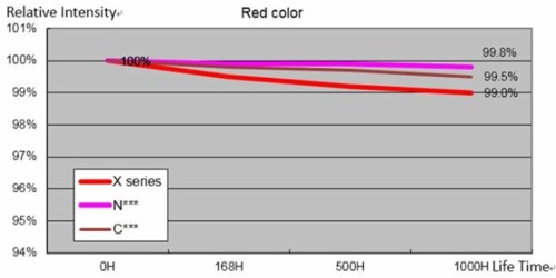 這種艾比森自主研發的燈珠,紅/綠/藍燈平均亮度為2200mcd/5200mcd/880mcd,而日亞燈的紅/綠/藍平均亮度只有1600mcd/3400mcd/750mcd;同時,A1699相比以往,紅燈亮度提升125%,這意味著消耗同樣功耗的屏體,亮度變得更高。燈在光衰測試中,A1699的表現也非常出色 ,R/G/B的1000小時高溫衰減實驗中顯示為零衰減。