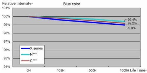 高溫65°、20mA條件下,1000時的光衰測試,與國際著名廠家LED基本持平。