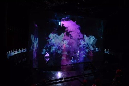 飄煙不見煙,舞臺上的煙霧繚繞其實就是投影機和紗幕配合下形成的效果。透過青煙還能看到后面的演員,迷離夢幻,恍若仙境。
