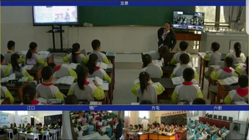 第一天,教育局工作人員、優秀教師等觀看了龍泉、江口、銅廠、方屯、六街五所小學的互動教學。在龍泉中心小學教室右邊桌上放置的的屏幕上能清晰地呈現出另外四個學校班級的情況,老師通過屏幕就能及時掌握所有學生的上課情況。同樣,老師上課時屏幕上呈現的文章內容以及音視頻也能通過紫旭錄播系統實時傳輸到其余學校,學生就如同坐在同一教室內上課一般。