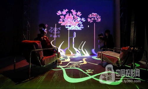 《對話》——旨在交流,即讓觀眾能和非遺文化進行“交流”。激光顯示和交互式沉浸體驗直接將非遺文化搬運至現代時空。這個展項的基礎設置非常簡單,一塊空地、一面墻、兩把椅子,再加兩臺激光投影機。實際上就是模擬一個現代生活空間的場景,相當于一個干凈一點的“毛胚房”,而視美樂7500LM激光工程投影機恰如一個魔術師,因為有了它才讓這一切變得生動和鮮活起來。
