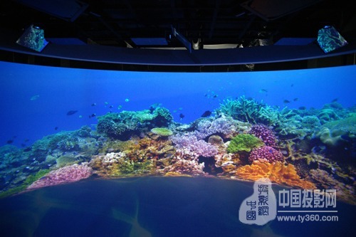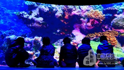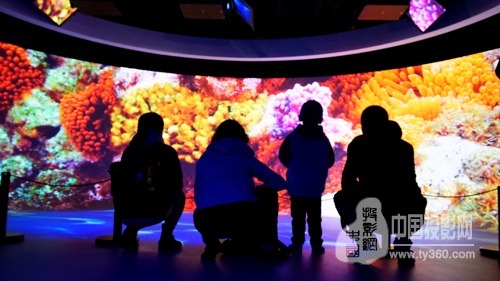 走進地下一層的圓形展廳,人們仿佛立刻潛入到熱帶海洋的斑斕水底。在這里,觀眾可以與形狀各異的魚群共游,在五光十色的珊瑚群中穿梭,眼前閃爍著陽光穿透海面灑下的點點光斑。占據展廳墻壁幾乎一半面積的曲面屏幕,仿佛可以將參觀者包裹其中,加之地面上不斷變換的粼粼波光,人們所獲得的沉浸式體驗可謂逼真而炫酷。第一批走進展廳的孩子們一會兒興奮地觸摸腳下的“水面”,一會兒歡叫著躲避迎面而來的“魚群”,而大人們也被這仿佛觸手可及的精美影像所吸引,連連發出贊嘆。