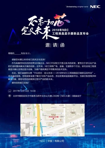 12月14日“不忘初芯•定義未來——2018年NEC工程液晶顯示器新品發布會”,誠邀您蒞臨現場,和NEC一起交流產品理念,探討未來發展,共同探索并打造具有劃時代意義及充滿未來感的新應用。
